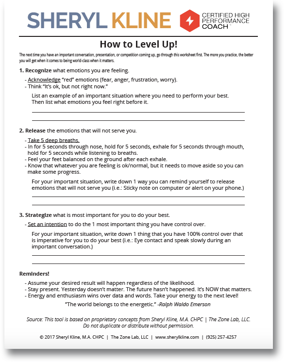 The next time you have an important conversation, project deliverable, or presentation coming up, go through this "How to Level-Up" worksheet first. You will learn three simple steps to control your emotions, and reset your mind for a world-class performance.